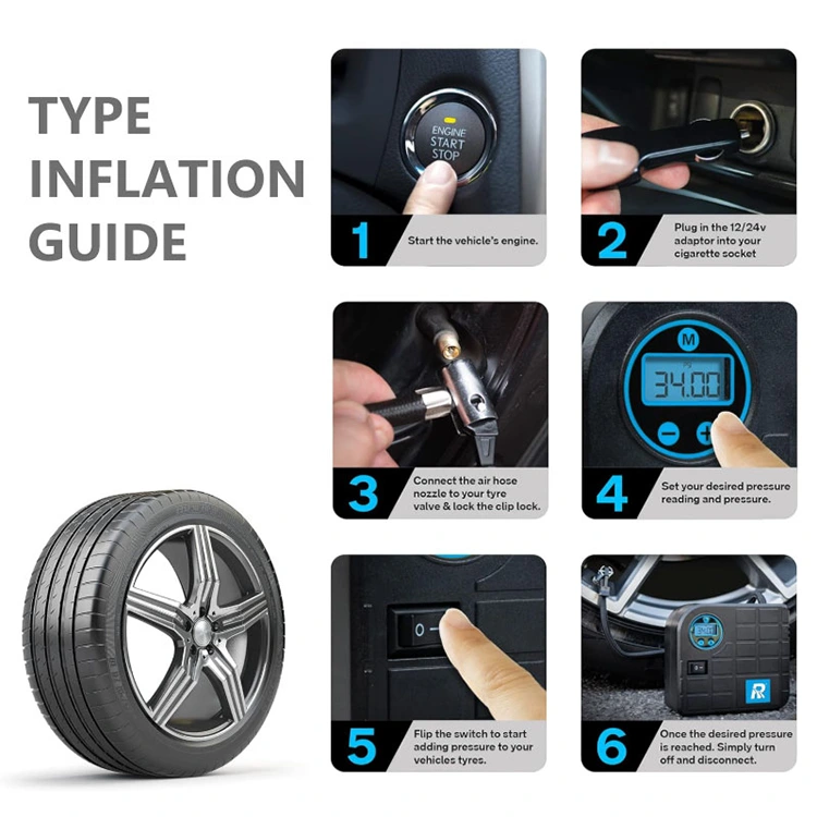 ປ້ໍາຢາງດິຈິຕອນນີ້ປິດໂດຍອັດຕະໂນມັດໂດຍກໍານົດຄວາມກົດດັນ. ສຽບເຂົ້າໄປໃນ 12V, ໃສ່ຫົວ Nozzle, ຕັ້ງ PSI, ກົດ Start. ງ່າຍດາຍ, ວ່ອງໄວແລະກຽມພ້ອມເມື່ອທ່ານຕ້ອງການ.