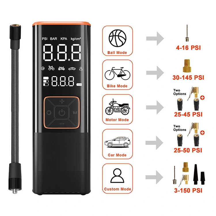 ຫນ່ວຍຄວາມກົດດັນ: PSI, KPA, BAR, BAR, KG / CM², ແລະສີ່ຮູບແບບອັດຕາເງິນເຟີ້. ທ່ານສາມາດກໍານົດຄວາມກົດດັນຂອງສີ່ຮູບແບບ preset ຕາມພາຫະນະຂອງທ່ານ. ເຄື່ອງສູບອາກາດນີ້ແມ່ນເຫມາະສົມສໍາລັບ: