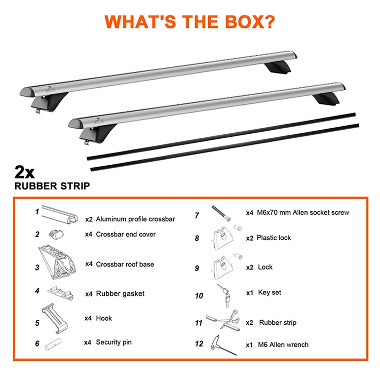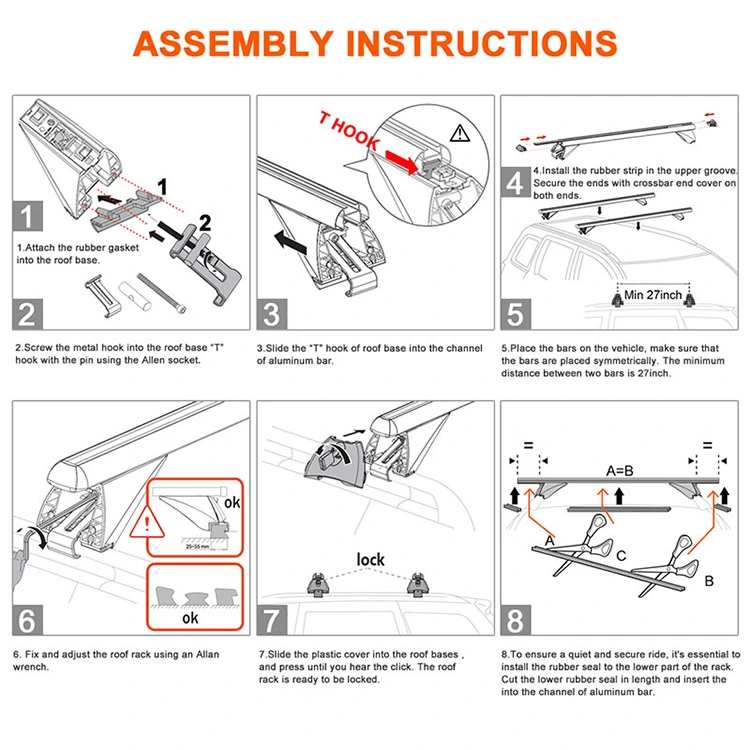 ແຖບຂ້າມຫລັງຄາເຫຼົ່ານີ້ແມ່ນການຕິດຕັ້ງງ່າຍ: Hex wrench ລວມຢູ່ໃນການຕັ້ງຄ່າ 10-min; ຄູ່ມືທີ່ມີຮູບແຕ້ມຂັ້ນຕອນໂດຍຂັ້ນຕອນ.